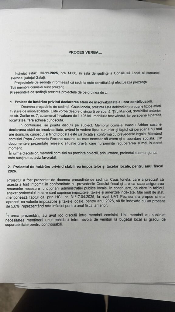 Un caz extrem de grav, cu potențiale implicații penale, s-a consumat în cadrul Consiliului Local Pechea, județul Galați, unde opoziția exprimată de un consilier AUR față de majorarea impozitelor și taxelor locale pentru anul 2026 a fost deliberat omisă din procesul-verbal al ședinței, document oficial cu valoare juridică.